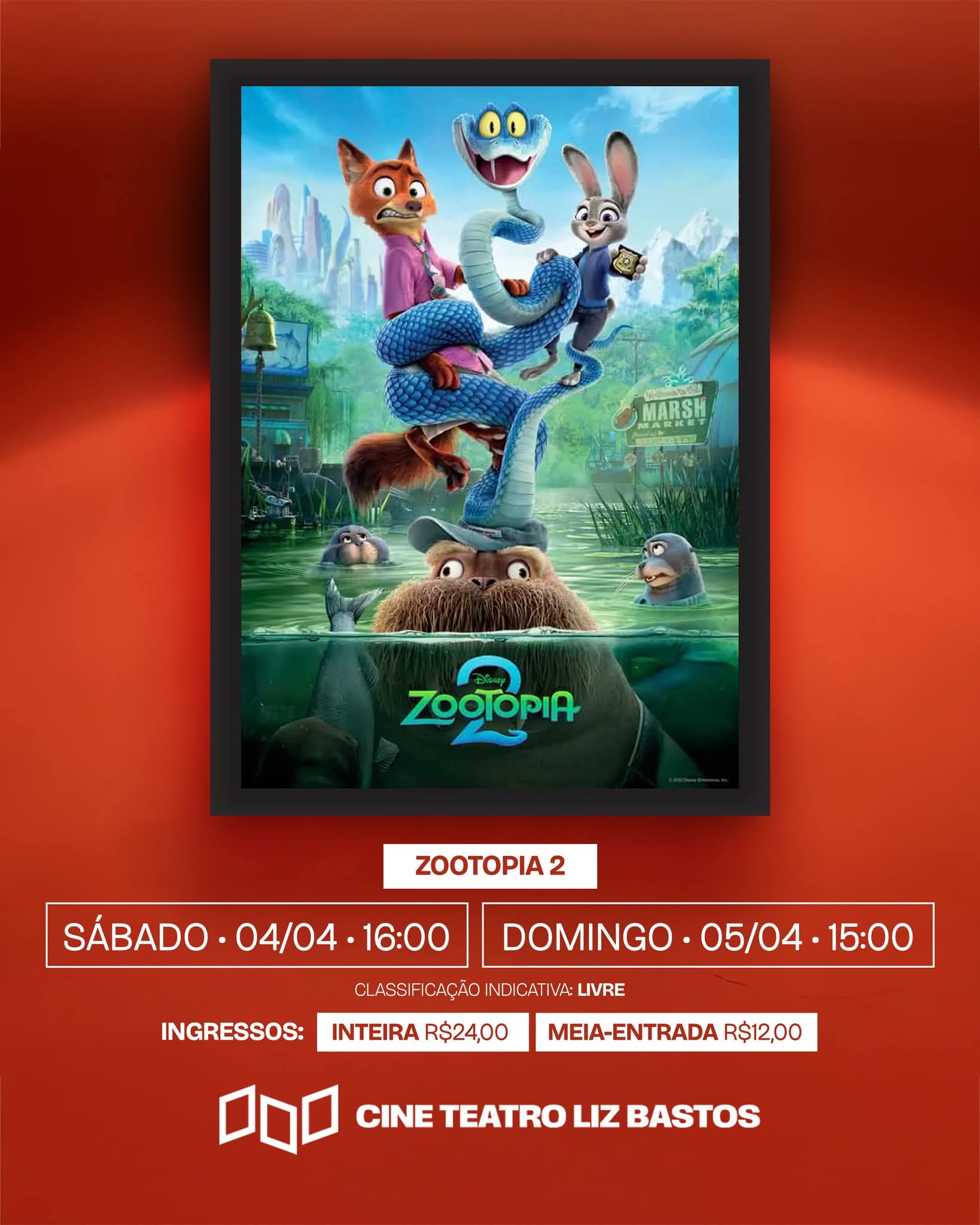 De 3 a 5 de abril, o Cine Teatro Liz Bastos recebe sessões para toda a família.